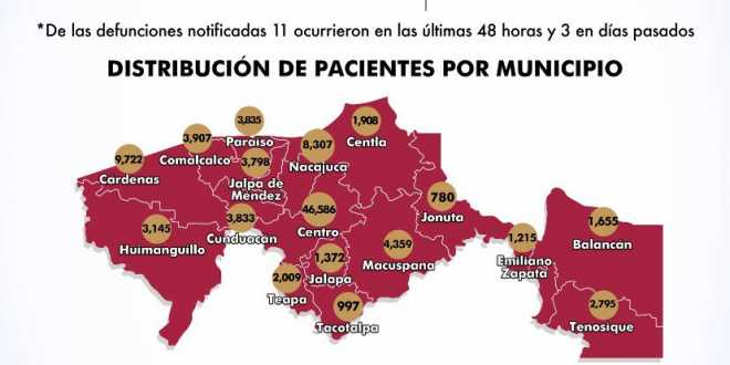 En la numeralia por municipios, Centro acumula 46 mil 586 casos; Cárdenas registra 9 mil 722; Nacajuca, 8 mil 307 personas contagiadas; Macuspana totaliza 4 mil 359 casos; y Comalcalco, 3 mil 907 pacientes infectados.