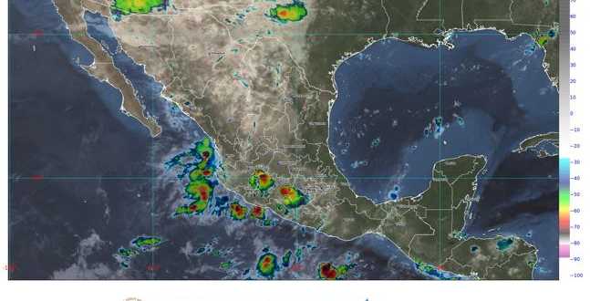 Hoy, se pronostican lluvias puntuales muy fuertes (de 50.1 a 75 milímetros [mm]) en Chiapas, Chihuahua, Coahuila, Colima, Durango, Estado de México, Guerrero, Jalisco, Michoacán y Oaxaca; fuertes (de 25.1 a 50 mm) en sitios de la Ciudad de México, Morelos, Nayarit, Puebla, Sinaloa, Sonora, Tlaxcala y Veracruz; intervalos de chubascos (de 5.1 a 25 mm) en Baja California Sur, Campeche, Guanajuato, Hidalgo, Nuevo León, Querétaro, Quintana Roo, San Luis Potosí, Tabasco, Tamaulipas, Yucatán y Zacatecas, y lluvias aisladas (de 0.1 a 5 mm) en Aguascalientes y Baja California.