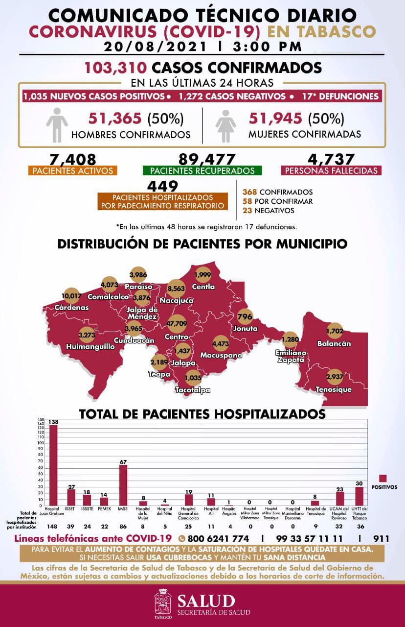 En cuando a la distribución de pacientes por municipios, Centro acumula 47 mil 709; Cárdenas registra 10 mil 017; Nacajuca, 8 mil 563; Macuspana, 4 mil 473; Comalcalco, 4 mil 073; Paraíso, 3 mil 986; Cunduacán, 3 mil 965; Jalpa de Méndez, 3 mil 876 y Huimanguillo, 3 mil 273 contagios.