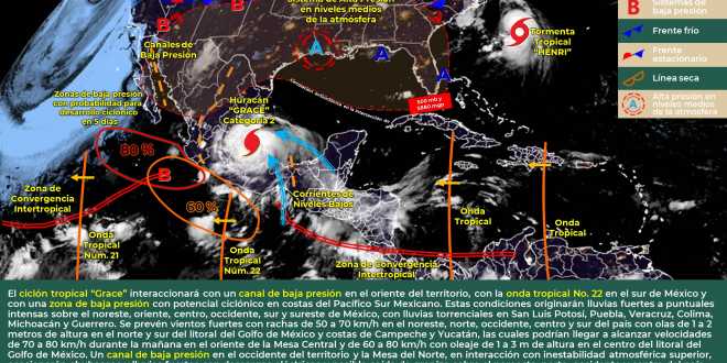 Las condiciones descritas serán generadas por el huracán Grace, de categoría 1 en la escala Saffir-Simpson, el cual recorrerá el centro de México, desplazándose hacia el oeste, en interacción con un canal de baja presión extendido sobre el oriente del país, y con la Onda Tropical Número 22 que recorrerá el sur de México; una zona de baja presión con potencial ciclónico que se desarrollará frente a las costas del Pacífico sur mexicano; y un canal de baja presión extendido sobre el occidente del territorio nacional y la Mesa del Norte, el cual interaccionará con inestabilidad atmosférica superior.