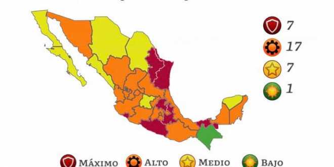 Son 17 los estados que se ubican en naranja, de riesgo alto de contagio. Otros siete presentan un riesgo medio, por lo que se les asignó el color amarillo, mientras que sólo Chiapas está en color verde, que indica bajo riesgo de contagio.