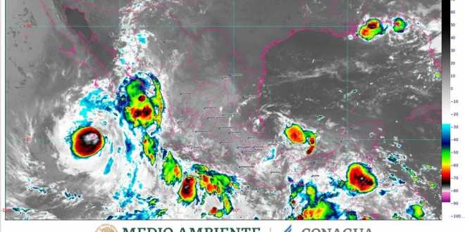 Para hoy, se pronostican lluvias puntuales intensas (de 75 a 150 milímetros [mm]) en sitios de Chiapas, Oaxaca y Veracruz; muy fuertes (de 50 a 75 mm) en áreas de Colima, Guerrero, Jalisco, Michoacán, Puebla y Tabasco; fuertes (de 25 a 50 mm) en regiones de Campeche, Baja California Sur, Nayarit, Quintana Roo, Sinaloa, Sonora y Yucatán; intervalos de chubascos (de 5.1 a 25 mm) en localidades de Chihuahua, Ciudad de México, Durango, Estado de México, Guanajuato, Hidalgo, Morelos y Tlaxcala, así como lluvias aisladas (de 0.1 a 5 mm) en zonas de Nuevo León, Querétaro, San Luis Potosí y Tamaulipas.
