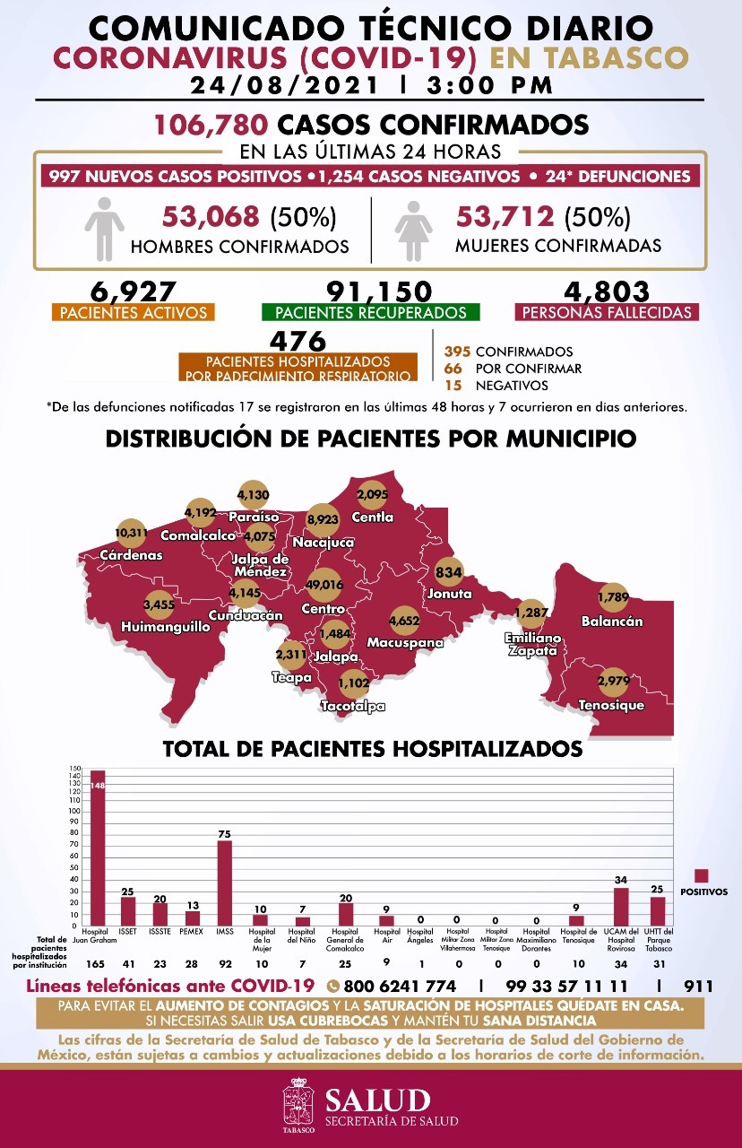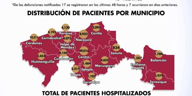 En la numeralia por municipios, Centro acumula 49 mil 16 casos; Cárdenas registra 10 mil 311; Nacajuca, 8 mil 923 personas contagiadas; Macuspana totaliza 4 mil 652 casos; y Comalcalco, 4 mil 192 casos.