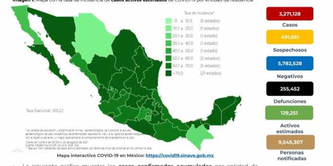 En México hasta el día de hoy se han confirmado 3,271,128 casos totales y 255,452 defunciones totales por