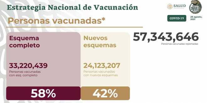 La Secretaría de Salud informa que con corte a las 21:00 h de este viernes 27 de agosto, 57 millones 343 mil 646 personas mayores de 18 años, es decir 64 por ciento de la población elegible, han recibido al menos una dosis de vacuna contra el virus SARS-CoV-2.