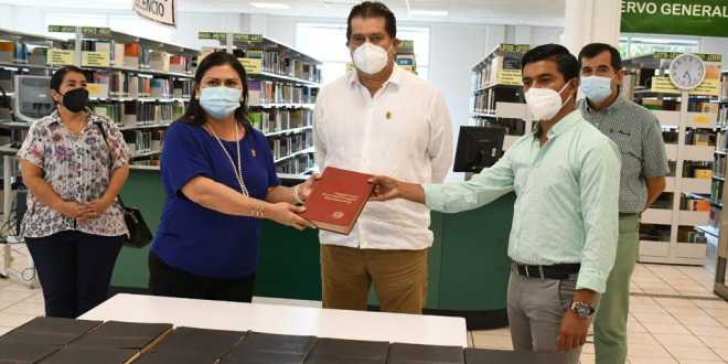 Acompañado por la directora de este campus, Thelma Leticia Ruiz Becerra y la secretaria de Servicios Académicos, Dora María Frías Márquez, el rector agradeció la donación de este material bibliográfico que estará al alcance de los estudiantes de la Licenciatura en Idiomas.