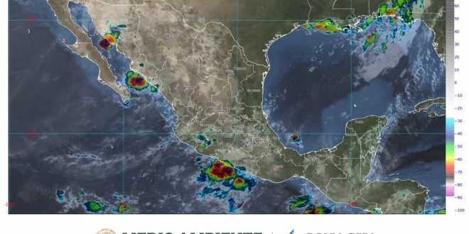 Para hoy, se pronostican lluvias puntuales intensas (de 75.1 a 150 milímetros [mm]) en Chiapas, Sinaloa y Sonora; muy fuertes (de 50.1 a 75 mm) en regiones de Chihuahua, Durango, Estado de México, Guerrero, Michoacán, Oaxaca, Puebla y Veracruz; fuertes (de 25.1 a 50 mm) en zonas de Aguascalientes, Ciudad de México, Colima, Guanajuato, Hidalgo, Jalisco, Morelos, Nayarit, Querétaro, San Luis Potosí, Tabasco, Tlaxcala y Zacatecas, e intervalos de chubascos (de 5.1 a 25 mm) en Baja California, Baja California Sur, Campeche, Coahuila, Nuevo León, Quintana Roo, Tamaulipas y Yucatán.