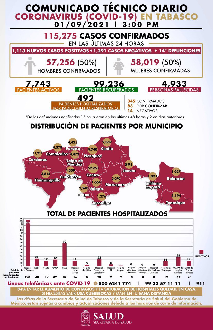 La Secretaría de Salud de Tabasco reportó este miércoles 1 mil 113 nuevos casos de Covid-19, además de 14 fallecimientos, y 492 personas hospitalizadas por padecimientos respiratorios, de las que 70.12% tienen diagnóstico confirmatorio a la enfermedad.