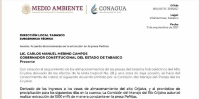 «Derivado de los ingresos a los vasos de almacenamiento del Alto Grijalva y al pronóstico de precipitaciones para los siguientes días en la cuenca, la Comisión del Manejo de Presas del Río Grijalva autorizó realizar la extracción a 1000 m3/s de manera constante en la Presa Peñitas», puntualiza la notificación del organismo federal.