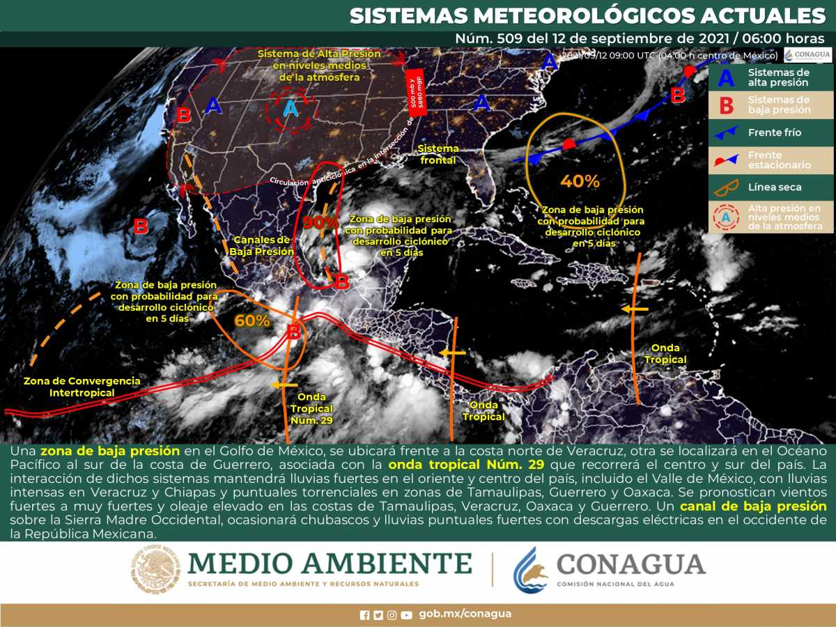 Reportó que para este domingo se espera un potencial de lluvias que iría de moderado a fuerte en gran parte del estado, aunque no se descartan precipitaciones muy fuertes aisladas en Teapa, Tacotalpa, Macuspana y Jonuta y norte de Chiapas.