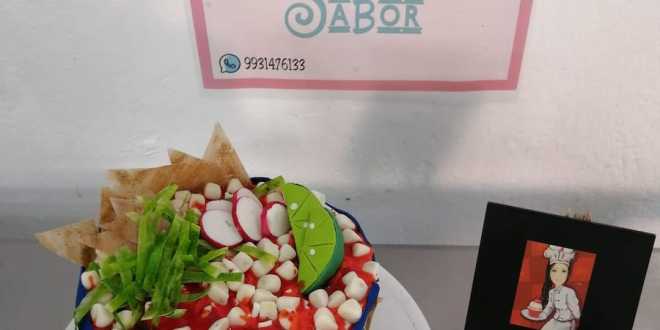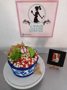 En esta temporada de fiestas patrias, “su plato fuerte es el pozole”, un pastel que está caracterizado como este tradicional platillo que acostumbra disfrutarse la noche del 15 de septiembre.