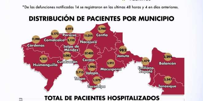 De acuerdo con la distribución de pacientes por municipios, Centro alcanzó 57mil 405 casos; Cárdenas, 11 mil 990 y Nacajuca, 11 mil 14 personas contagiadas.