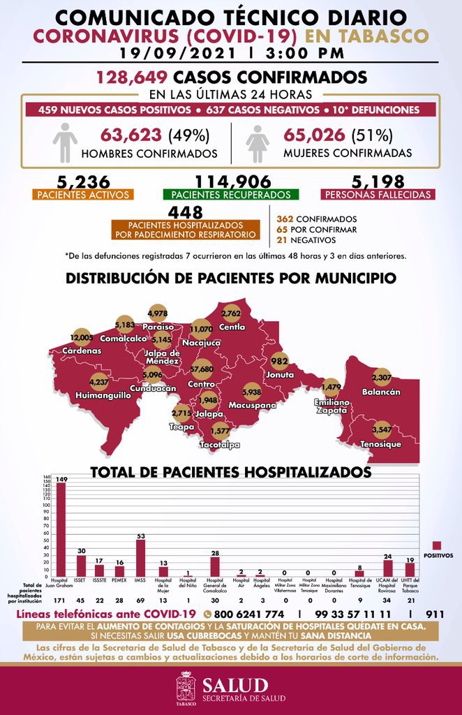 El reporte que consigna el comportamiento del nuevo coronavirus menciona que, hasta las 15 horas de este domingo 19 de septiembre, ya son 128 mil 649 casos confirmados y 5 mil 198 decesos por el virus, así como 114 mil 906 las personas que se recuperan, 5 mil 236 activos y 448 hospitalizados por distintos males respiratorios.