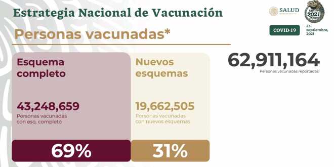 La Secretaría de Salud informa que 62 millones 911 mil 164 personas han sido vacunadas contra COVID-19, con lo que 43 millones 248 mil 659 cuentan con esquema completo, que equivale a 69 por ciento, y 19 millones 662 mil 505 tienen al menos una dosis, que representan 31 por ciento.