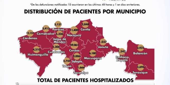 En cuanto a la distribución de casos por municipios, 59 mil 061 registra el municipio de Centro; le sigue Cárdenas, con 12 mil 157; Nacajuca, con 11 mil 400; Macuspana, con 6 mil 180; Comalcalco, con 5 mil 413; y Jalpa de Méndez, con 5 mil 326.