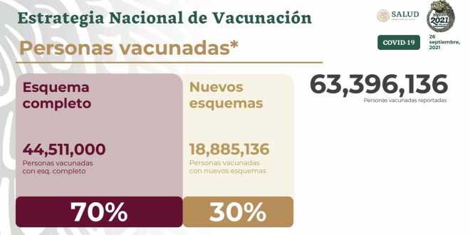 La Secretaría de Salud informa que 63 millones 396 mil 136 personas han sido vacunadas contra COVID-19. De ellas, 70 por ciento, es decir 44 millones 511 mil, cuenta con esquema completo, y 18 millones 885 mil 136 tienen al menos una dosis, que representan 30 por ciento.