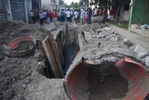 De acuerdo con los habitantes afectados en la calle Caoba se formó un tapón en el drenaje pluvial y la compañía que está a cargo de la obra atendió la falla y constató que en un tramo de al menos 30 metros se aplastó el tubo corrugado de polietileno, por lo que el agua desbordó.
