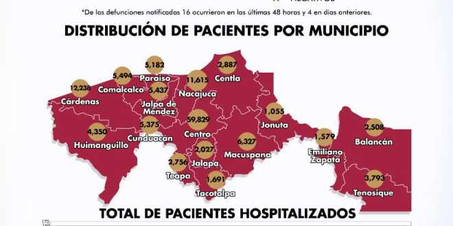 De acuerdo con la distribución de pacientes por municipios, Centro alcanzó 59 mil 829 casos; Cárdenas, 12 mil 238 y Nacajuca, 11 mil 615 personas contagiadas.