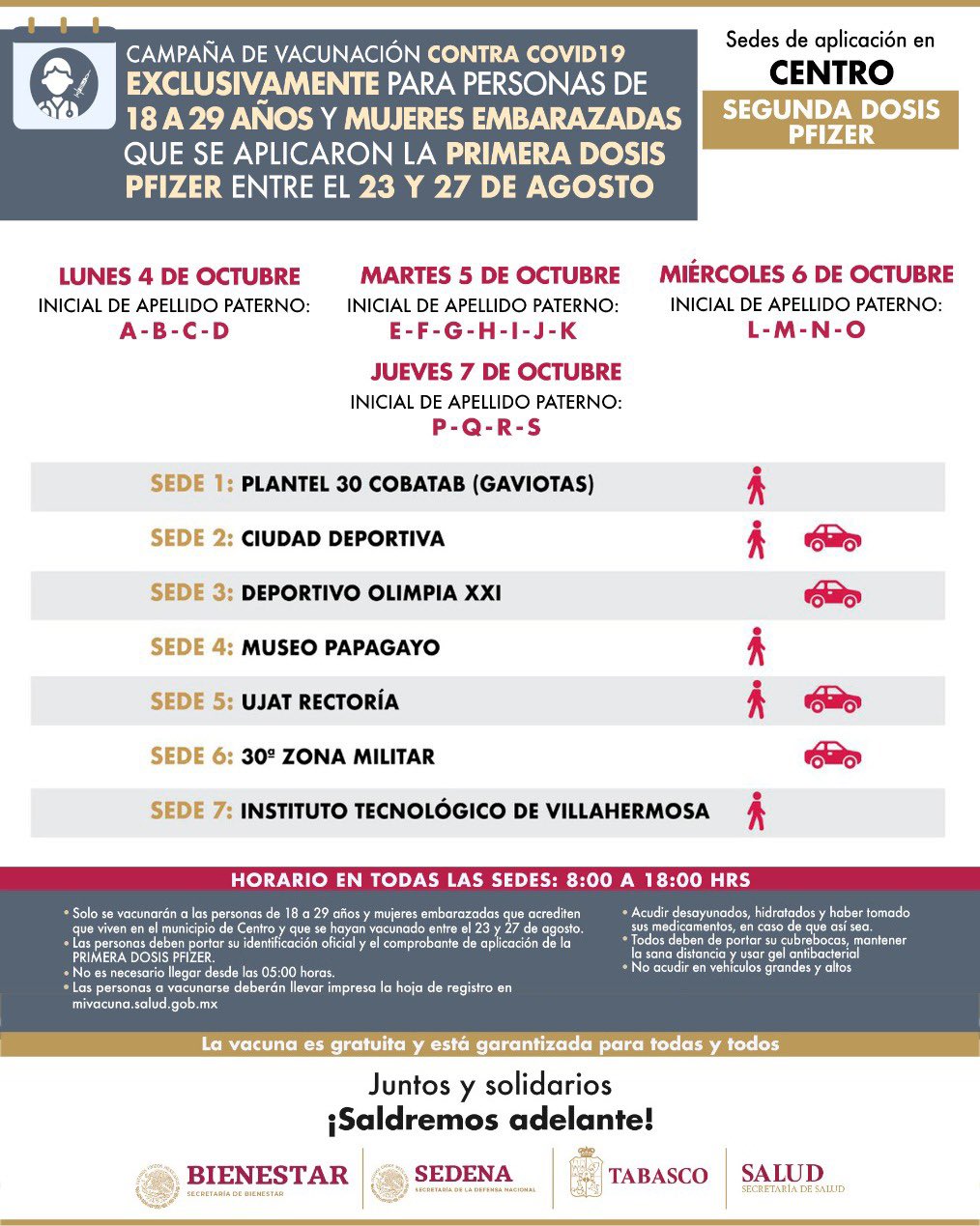 La Secretaría de Salud estatal, informó que, del 4 al 7 de octubre, realizará la aplicación de la segunda dosis de la vacuna de Pfizer contra el COVID-19, a los jóvenes de 18 a 29 años de edad y mujeres embarazadas en el área urbana del municipio de Centro.