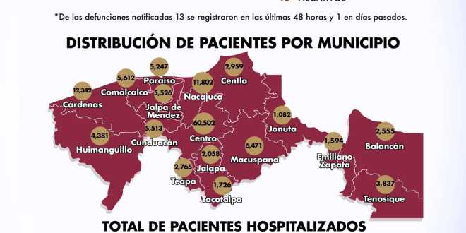 De acuerdo con la distribución de pacientes por municipios, Centro registra 60 mil 502 casos; Cárdenas, 12 mil 342; Nacajuca, 11 mil 802; Macuspana, 6 mil 471 y Comalcalco, 5 mil 612.