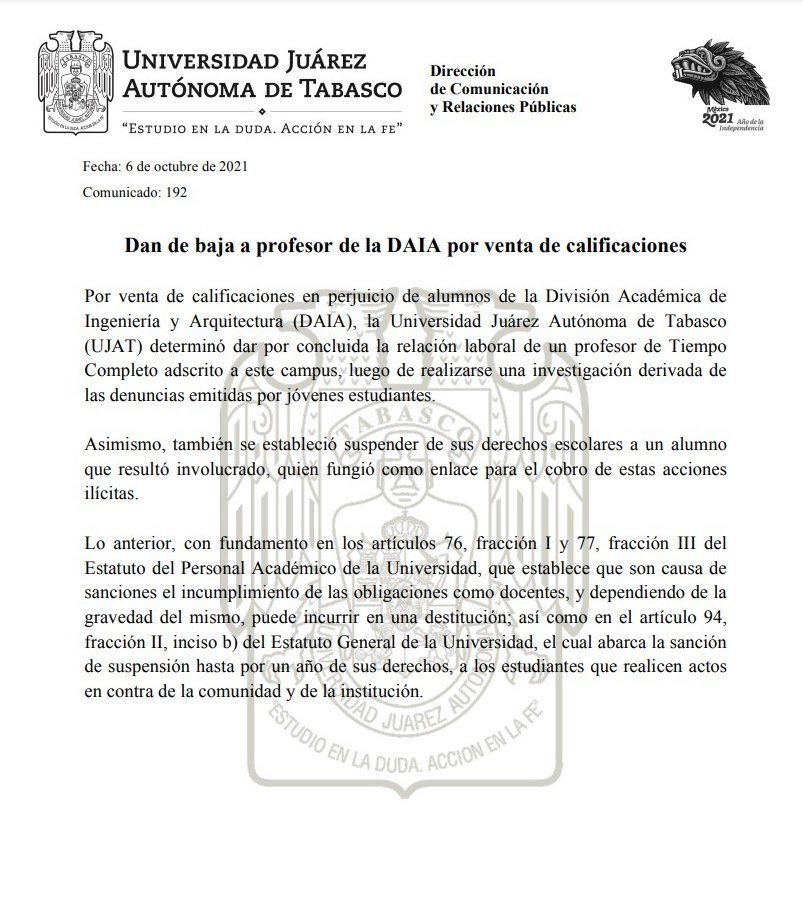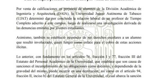 Por venta de calificaciones en perjuicio de alumnos de la División Académica de Ingeniería y Arquitectura (DAIA), la Universidad Juárez Autónoma de Tabasco (UJAT) determinó dar por concluida la relación laboral de un profesor de Tiempo Completo adscrito a este campus, luego de realizarse una investigación derivada de las denuncias emitidas por jóvenes estudiantes.