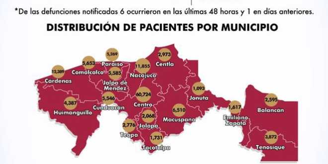 En cuanto a la evolución del COVID-19 por municipios, 60 mil 724 registra el municipio de Centro; le sigue Cárdenas, con 12 mil 389; Nacajuca, con 11 mil 855 y Macuspana, con 6 mil 510 casos.