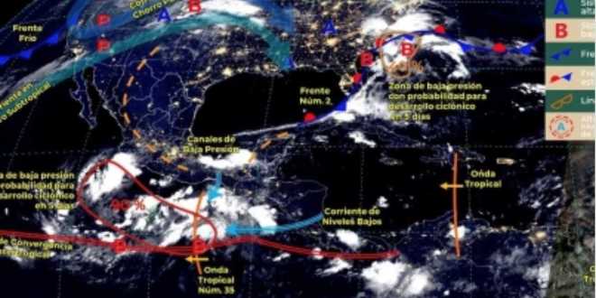 De acuerdo al pronóstico,  se prevén lluvias dispersas a moderadas aisladas de 5.1 a 25 milímetros en Balancán, Huimanguillo, Tacotalpa, Teapa y Tenosique, así como baja probabilidad de tormentas y actividad eléctrica.