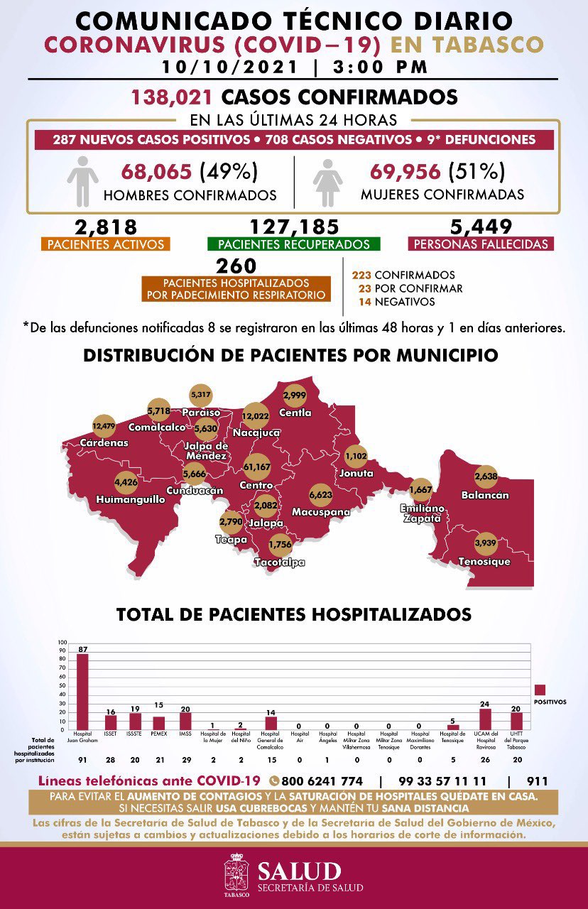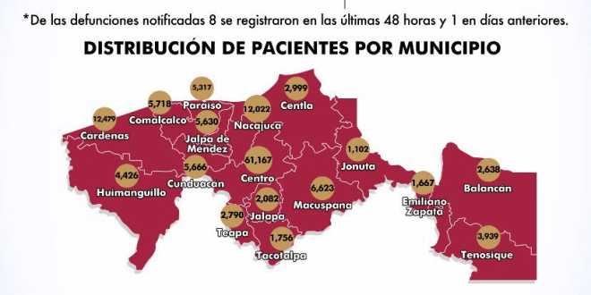 En la numeralia por municipios, Centro acumula 61 mil 167 casos; Cárdenas registra 12 mil 479; Nacajuca, 12 mil 22 personas contagiadas; Macuspana totaliza 6 mil 623 casos; y Comalcalco con 5 mil 718 casos.