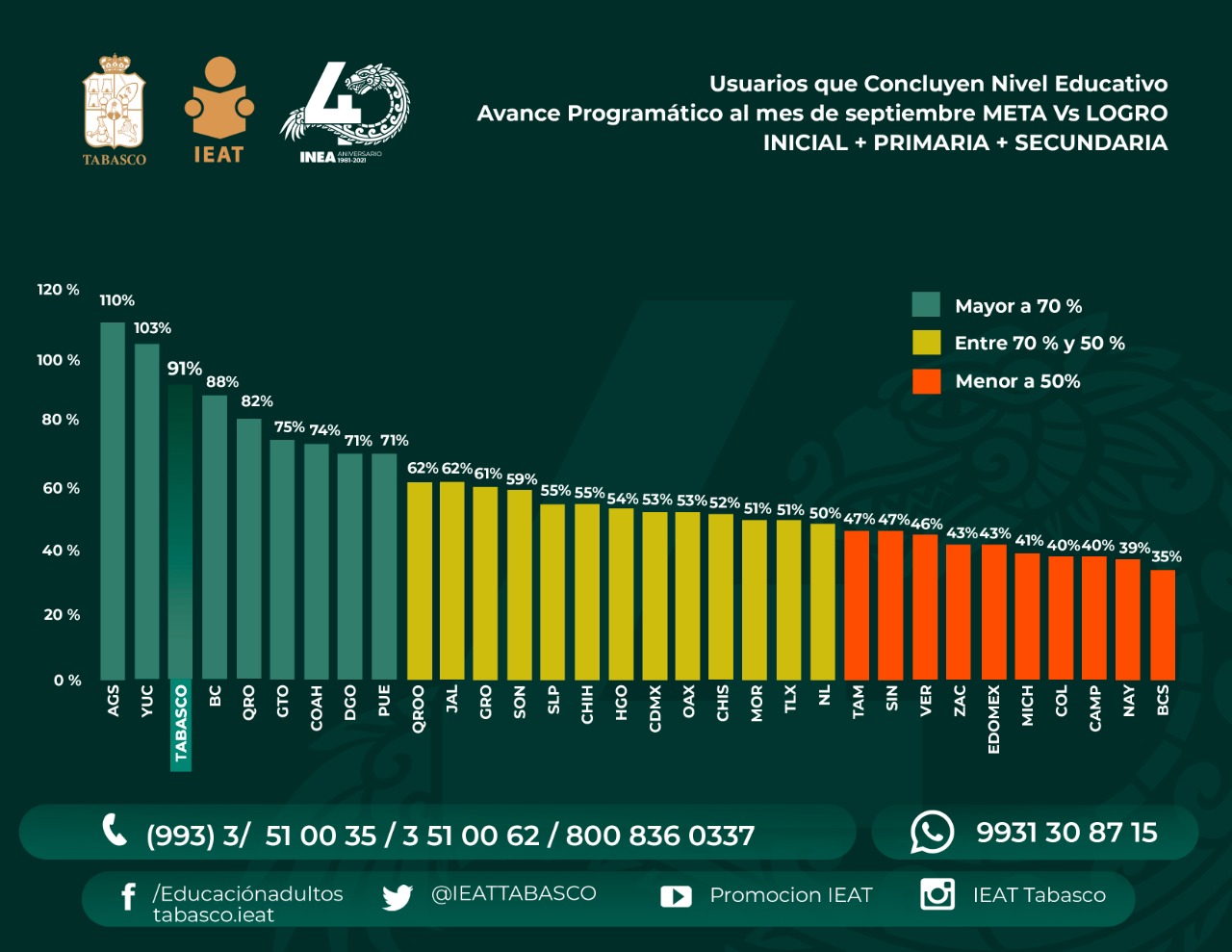 En este ciber encuentro el titular del Instituto de Educación para Adultos de Tabasco (IEAT), fue informado que en el parámetro nacional de cumplimiento, Tabasco está en verde dentro del grupo de estados con más del 70 por ciento de logro, es decir con óptimo desempeño.