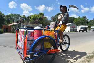 En Nacajuca, Jesús Santiago vende bolis de una manera muy peculiar: vestido de la muerte. Usa una máscara y una güadaña con la que, previo al Día de Muertos, invita a la gente a visitar los panteones.