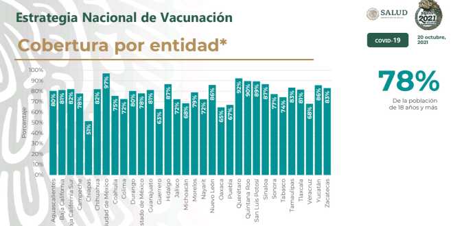 Por entidad federativa, la Ciudad de México se mantiene a la cabeza en cobertura de vacunación con 97 por ciento, seguida de Querétaro con 92 por ciento; mientras que 20 entidades más reportan avances superiores al 75 por ciento de su población adulta.