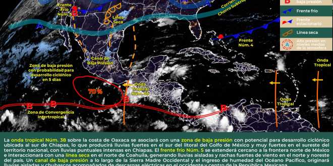 El Instituto de Protección Civil del Estado (IPCET), informó que este miércoles la influencia de la Onda Tropical No. 38 junto a canales de baja presión, favorecerán lluvias en las zonas serranas del sur del estado y la zona costera.