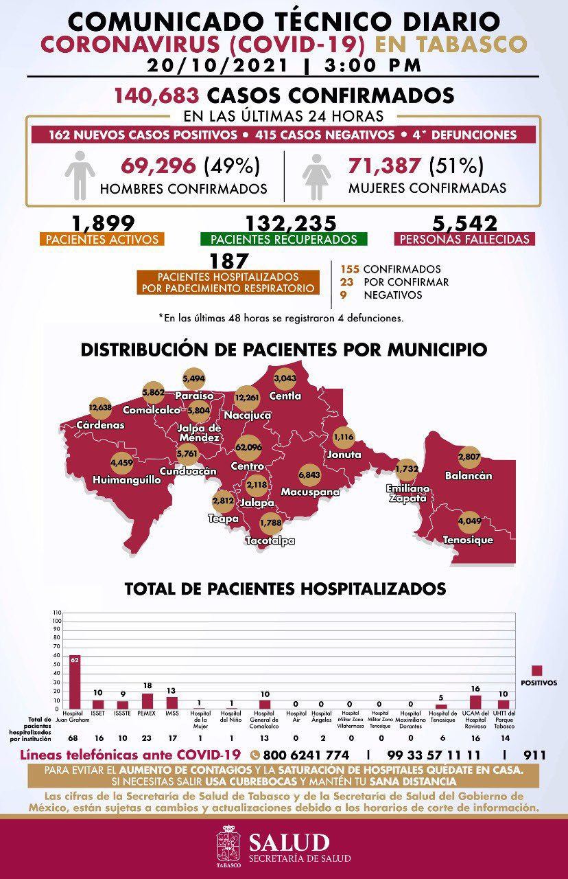 En su reporte de este miércoles, con corte a las de la tarde precisa que del total de pacientes hospitalizados, 68 se encuentran en el Hospital Regional de Alta Especialidad “Dr. Juan Graham Casasús”; 23 están en el Hospital de Pemex; 17 en el IMSS; 16 en la UCAM del Hospital Rovirosa y misma cifra en el ISSET.