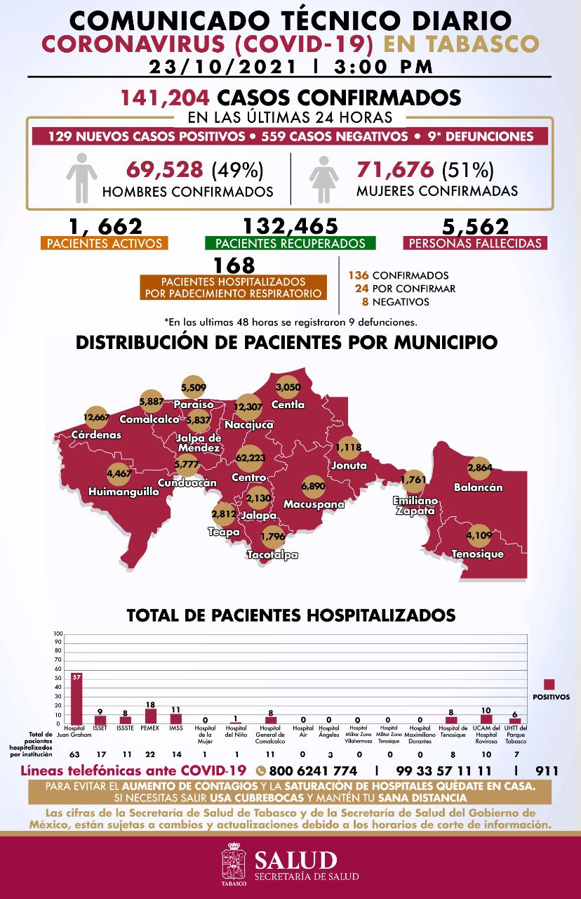 En su reporte de este sábado, con corte a las 3:00 de la tarde precisa que del total de pacientes hospitalizados, 63 se encuentran en el Hospital Regional de Alta Especialidad “Dr. Juan Graham Casasús”; 22 están en el Hospital de Pemex; 17 en el ISSET; 14 en el IMSS; 11 en el ISSSTE y misma cifra en el Hospital de Comalcalco.