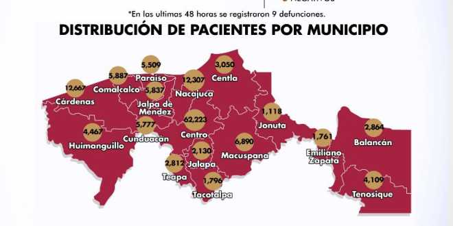 En cuanto al COVID-19 por municipios, 62 mil 223 registra el municipio de Centro; le sigue Cárdenas con 12 mil 667; Nacajuca con 12 mil 307; Macuspana con 6 mil 890; Comalcalco con 5 mil 887; Jalpa de Méndez con 5 mil 837; Cunduacán 5 mil 777; Paraíso con 5 mil 509; Huimanguillo 4 mil 467; Tenosique 4 mil 109; Centla con 3 mil 050; Balancán 2 mil 864; Teapa con 2 mil 812; Jalapa con 2 mil 130; Tacotalpa 1 mil 796; Emiliano Zapata 1 mil 761 y Jonuta con 1 mil 118 casos.