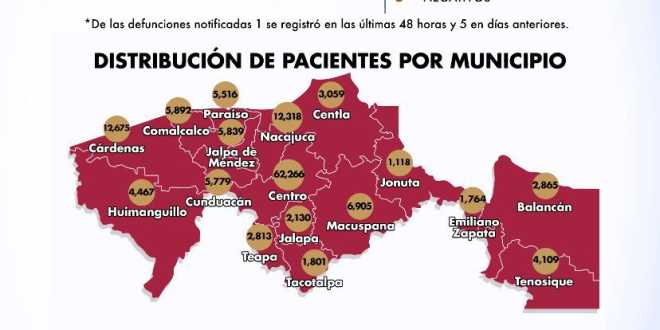 En cuanto a la distribución de pacientes por municipios, Centro acumula 62 mil 266 casos; Cárdenas registra 12 mil 675; Nacajuca, 12 mil 318 personas contagiadas; Macuspana totaliza 6 mil 905 casos; y Comalcalco con 5 mil 892 casos.