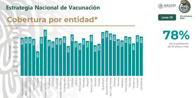 Las 32 entidades federativas reportan un total de 115 millones 185 mil 985 dosis aplicadas desde el 24 de diciembre. El mayor avance se registra en Ciudad de México, con 97 por ciento; Quintana Roo, 95 por ciento, Querétaro, 92 por ciento; y San Luis Potosí, 89 por ciento.