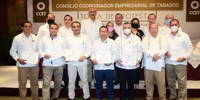 on un llamado a la clase empresarial a no desaprovechar el momento histórico que vive Tabasco como “capital energética de México”, nodo logístico del Sureste, y punto neurálgico de proyectos estratégicos de la Cuarta Transformación, el gobernador Carlos Manuel Merino Campos tomó protesta a la nueva directiva del Consejo Coordinador Empresarial (CCET) para el período 2021-2022, integrado por Edgar Alejandro Garduño Paz como presidente; José Luis González Valencia, secretario y Víctor Manuel Cervantes Calcáneo, tesorero.