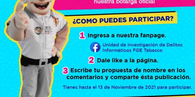 La Unidad de Investigación de Delitos Informáticos (UIDI) de la Fiscalía General del Estado (FGE) de Tabasco lanzó la convocatoria para ponerle nombre a su mascota, una conocida botarga que ya se ha sumado a las actividades de prevención de delitos y procuración de justicia.