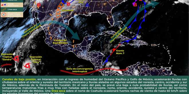 Informó que se esperan temperaturas máximas de 27 a 31 grados centígrados y mínimas de 18 a 21 grados, con vientos del Noreste y Sureste de 10 a 15 kilómetros por hora y rachas de 20 a 30 kilómetros por hora.