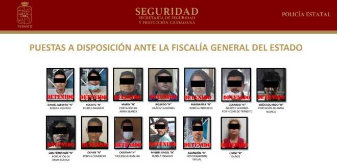 Un total de 13 presuntos responsables fueron puestos a disposición de la Fiscalía General del Estado (FGE) relacionados con delitos como robo a comercio, violencia familiar, portación de arma blanca, daños y lesiones, entre otros.
