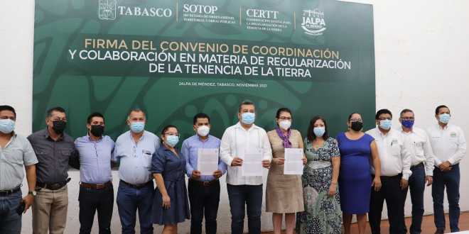 Con la finalidad de dar certeza jurídica a personas que viven en situación de irregularidad y trabajar en la regularización de espacios públicos del municipio que no cuentan con documentos que acrediten su propiedad, este día el titular de la Coordinación Estatal para la Regularización de la Tenencia de la Tierra (CERTT), Francisco Sánchez Ramos, y la Presidenta Municipal, la Lic. Nuris López Sánchez, firmaron el convenio de coordinación y colaboración en materia de regularización de la tenencia de la Tierra. Además, se hizo entrega de títulos de propiedad a favor de la Esc. Prim. “José María Morelos y Pavón”, del Pob. Iquinuapa.