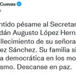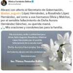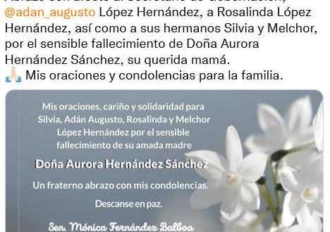 Diversos políticos han expresado sus condolencias al secretario de Gobernación, Adán Augusto López Hernández por el fallecimiento de su señora madre Aurora Hernández Sánchez; luego que el presidente Andrés Manuel López Obrador lo diera a conocer el día de hoy en la rueda de prensa matutina.