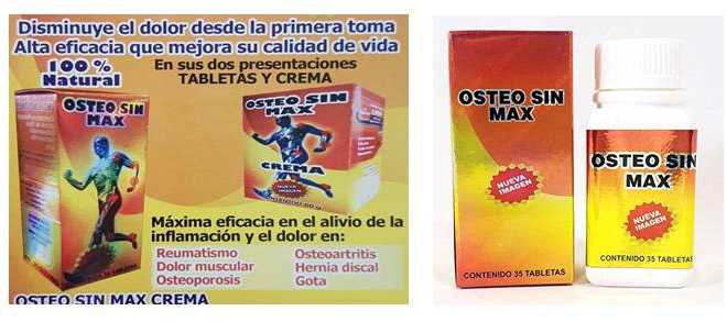 “Osteo Sin Max”, el cual se oferta en presentaciones crema y tabletas, y se comercializa como relajante muscular y desinflamatorio. El producto aparenta estar indicado para hernias de disco, osteoporosis, osteoartritis y gota.