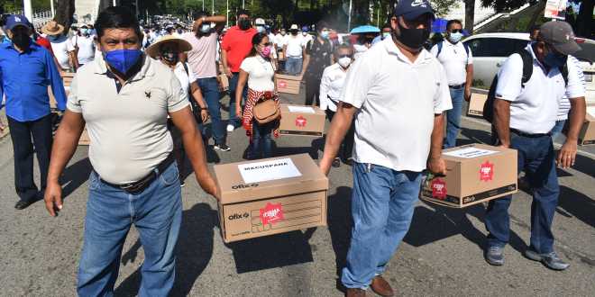 Cientos de afiliados a la Coalición por el Rescate a los Derechos ante el Isset se concentraron en el parque Tomás Garrido, para agrupar 43 cajas que contenían las firmas que por más de dos meses reunieron.