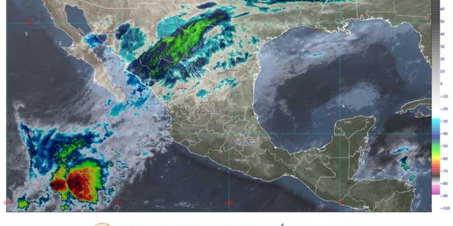 En el Pacífico Norte se prevé viento de dirección variable de 20 a 35 km/h con rachas de 50 a 60 km/h, cielo nublado, ambiente templado hacia la tarde y descargas eléctricas en zonas de lluvia. En sierras de Sonora se espera ambiente matutino de frío a muy frío, con condiciones para la caída de aguanieve o nieve.