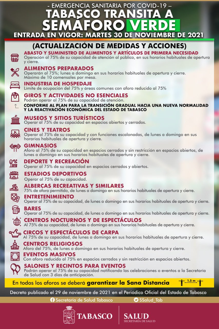 De acuerdo a la semaforización epidemiológica que a principios de la emergencia sanitaria determinó el Gobierno Federal en coordinación con las entidades federativas, el color verde permite que las actividades económicas y sociales se lleven a cabo de manera habitual, en función de las medidas que establezcan las autoridades sanitarias.