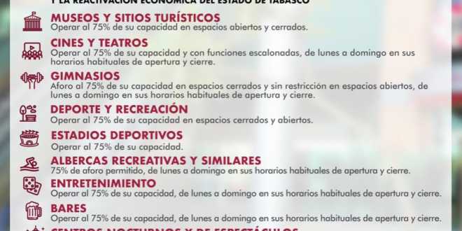 Las nuevas disposiciones avaladas por el gobernador Carlos Manuel Merino Campos, demandan a la población mantener las medidas higiénicas, de sana distancia y uso obligatorio del cubrebocas, para avanzar en el Plan de Transición Gradual hacia una Nueva Normalidad y la Reactivación Económica del Estado de Tabasco.