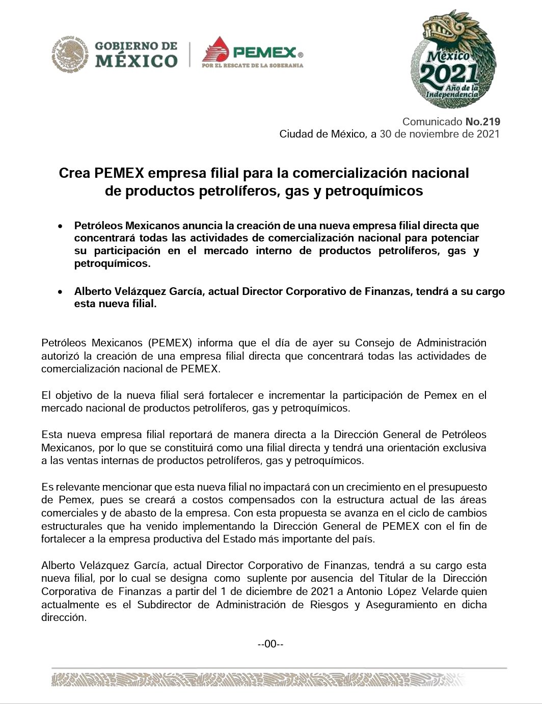 Petróleos Mexicanos (PEMEX) informa que el día de ayer su Consejo de Administración autorizó la creación de una empresa filial directa que concentrará todas las actividades de comercialización nacional de PEMEX.