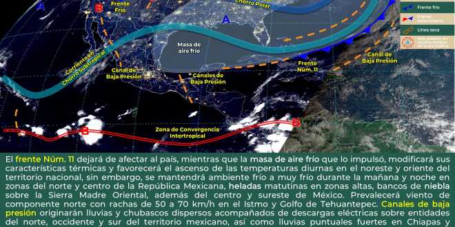 El Instituto de Protección Civil del Estado (IPCET) informó que, la masa de aire que impulsó al Frente Frío No. 11 y un canal de baja presión, limitados por aire seco, generará lluvias ligeras intermitentes con chubascos durante el día, incrementando por la tarde con lluvias moderadas de forma aislada, persistiendo con lluvias ligeras esporádicas al final de la tarde e inicios de la noche.